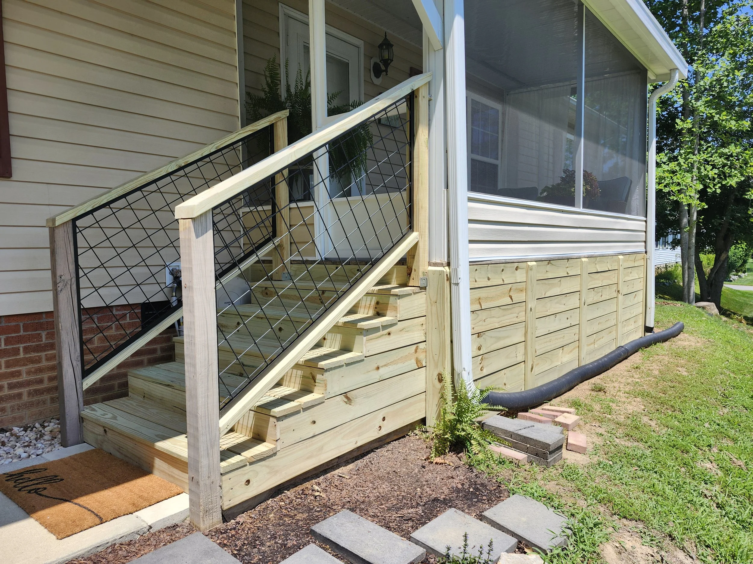 Completed Work 2025 Water and tree damage repair Elegant Back Deck Solid wall from bay window Storm and tree damage repair Private Pool Porch Facelift Catio Build Deck extension