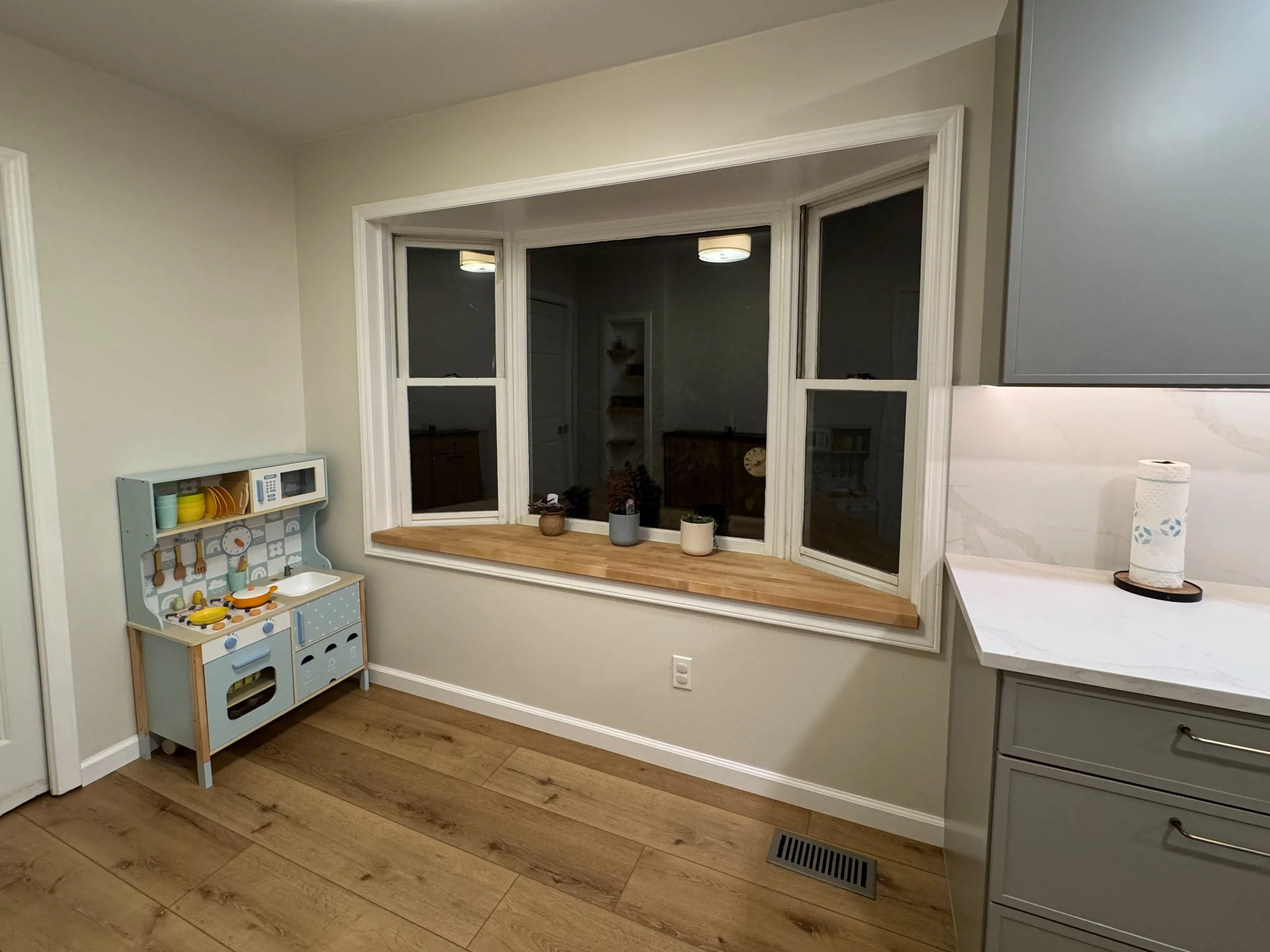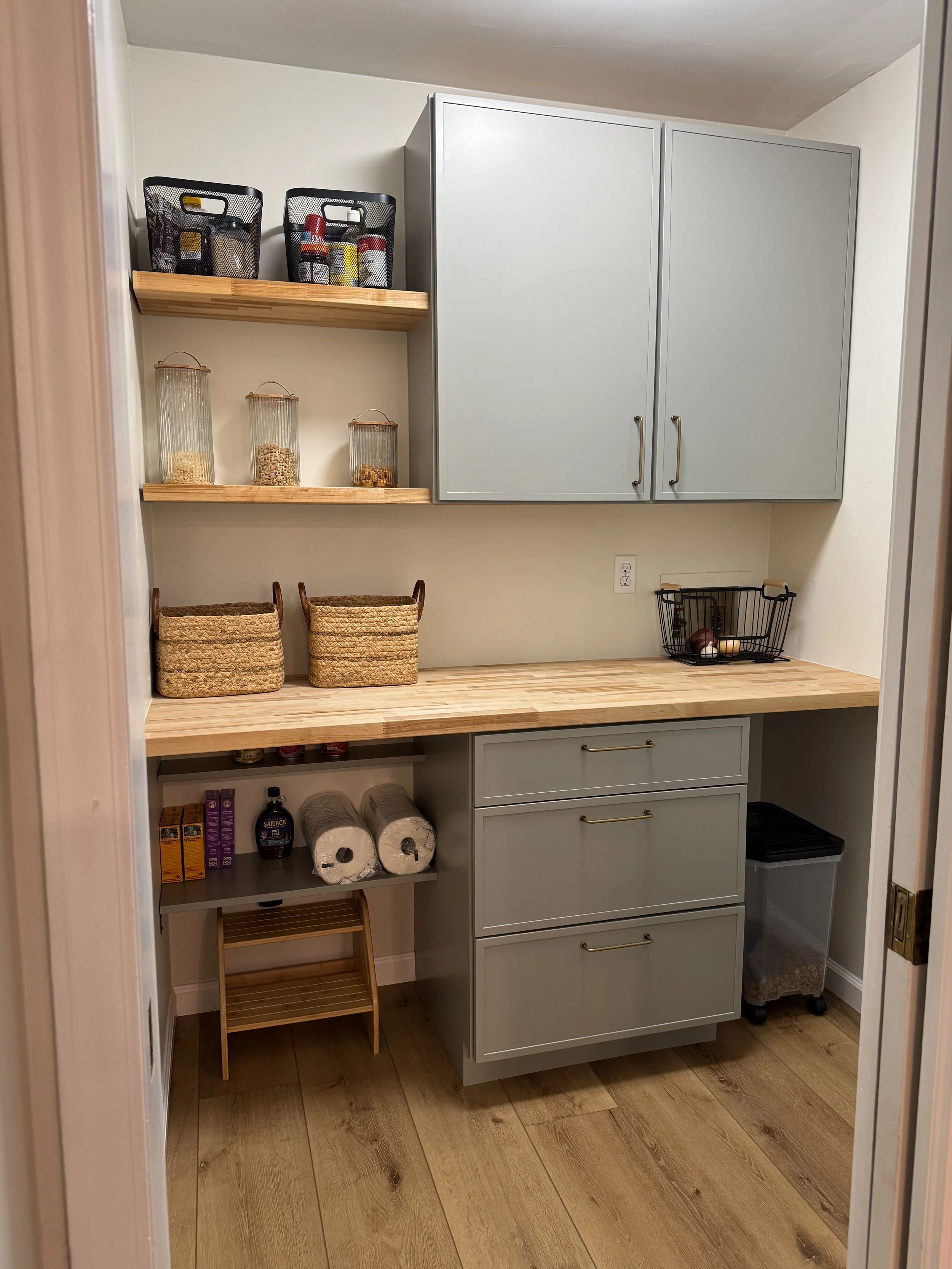 Custom built butcher block pantry (previously a washer/dryer area), bay window seat and spice nook (previously a fold out ironing board)