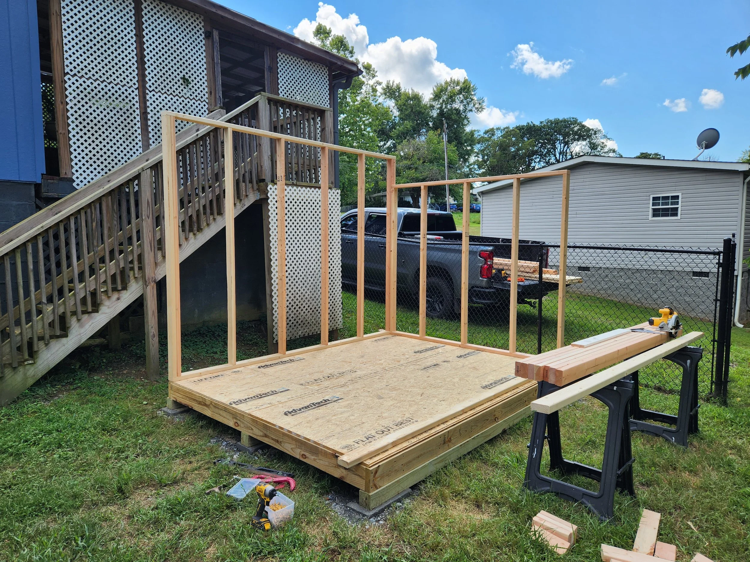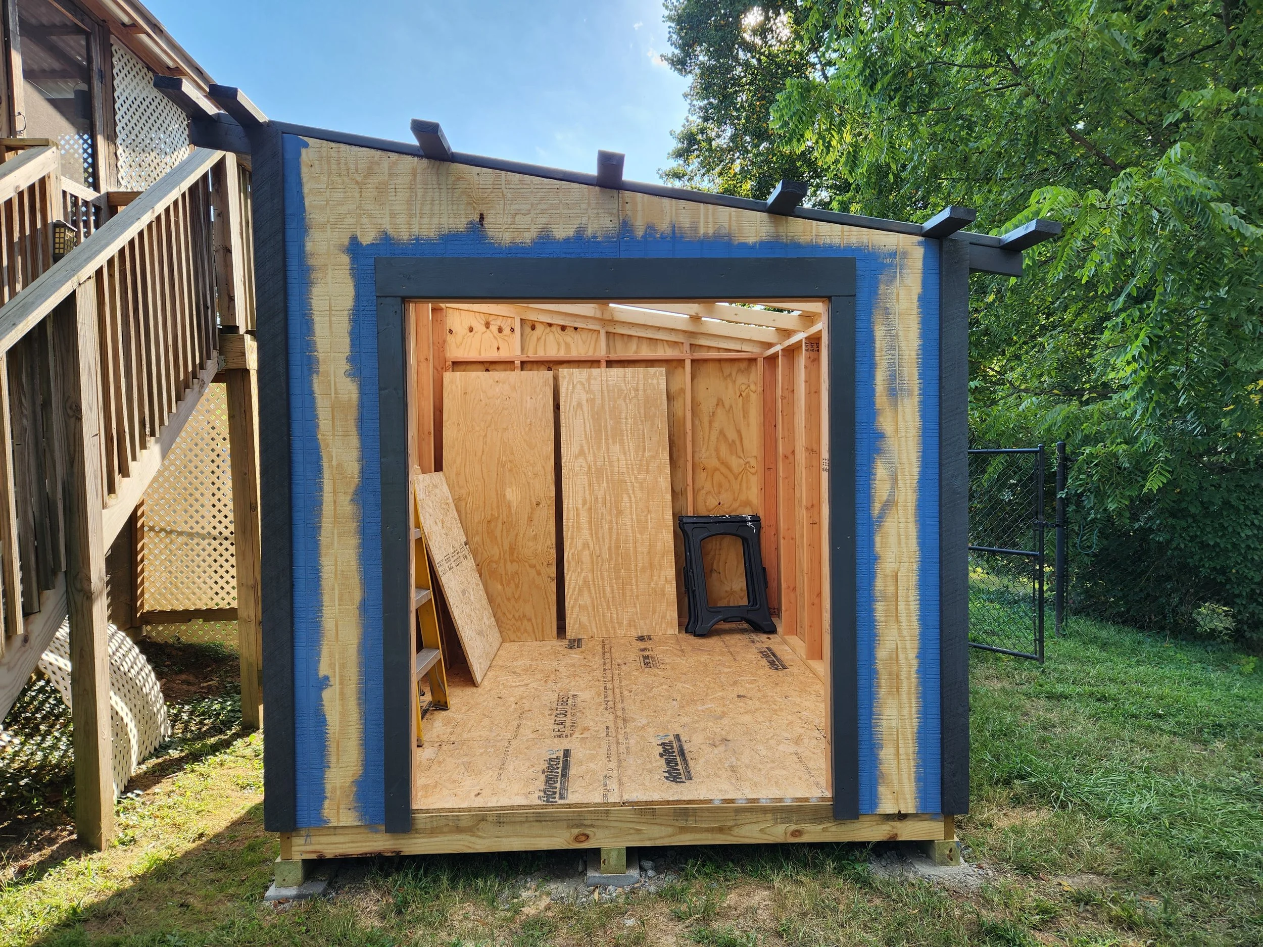 Custom designed and built 8x10 slant shed with metal roof. Color matched to accentuate the house